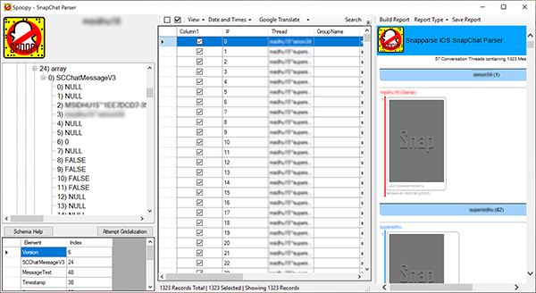 Simply drag and drop the 'chatConversationStore.plist' file into Spoopy and it will parse the data into a treeview. It will then attempt to use it's known schemas to place that data into a tableview (giving you the opportunity to intervene if the schema is not recognized). Once the data is in the table, select/deselect, search and date filter the results as well as utilizing Google Translate to automatically translate the message content. Finally, create a HTML report from your selections which actually looks like a SnapChat conversation. Note that media decryption is not even attempted at this time. This software is still in development and more features may be added soon. Check out the blog post related to the software for information on how the file is parsed. |